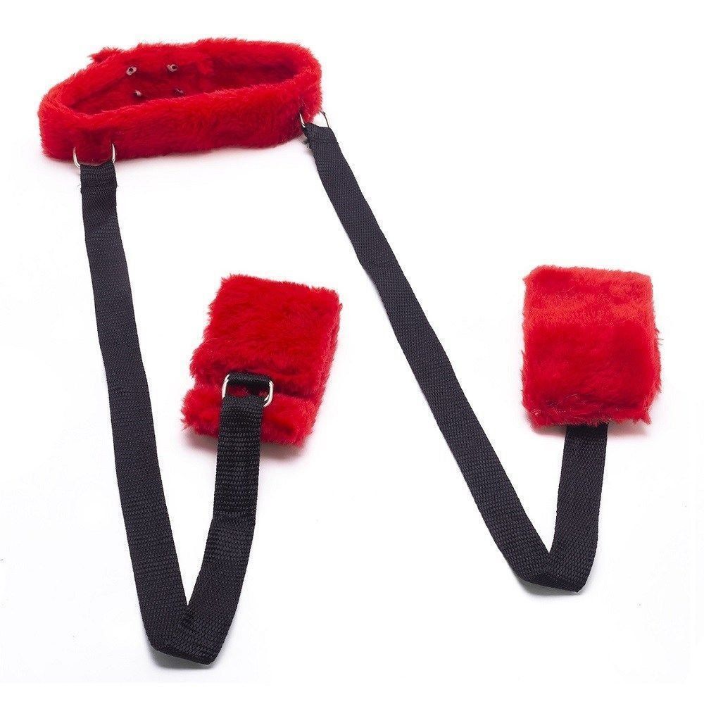 Feitas em pelúcia e ligadas por uma fita de nylon, essas peças têm fivelas ajustáveis que permitem um encaixe perfeito no corpo do submisso.