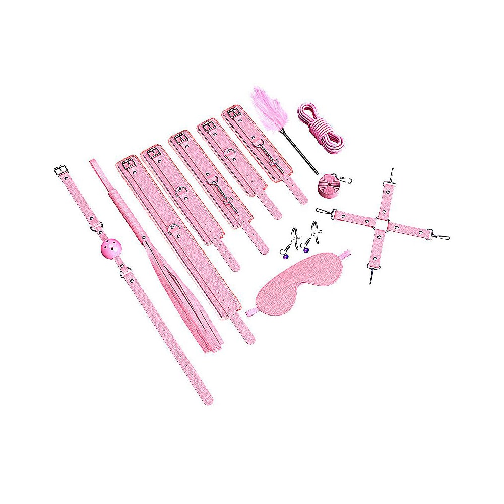 Explore novas sensações e intensifique a cumplicidade a dois com o Kit completo BDSM com 10 acessórios de pelúcia rosa.